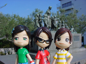 た:1時間後,フェリーは,無事,土庄港に到着。船が港に近付くとごま油の香りがするね。 よ:これは,港にある工場からのにおいだね。ここで作られるごま油は,手延べそうめんの材料のひとつだよ。それより,二十四の瞳の像の前で記念写真を撮ろうよ。ほれ,HDSED,働くんだよ。 |